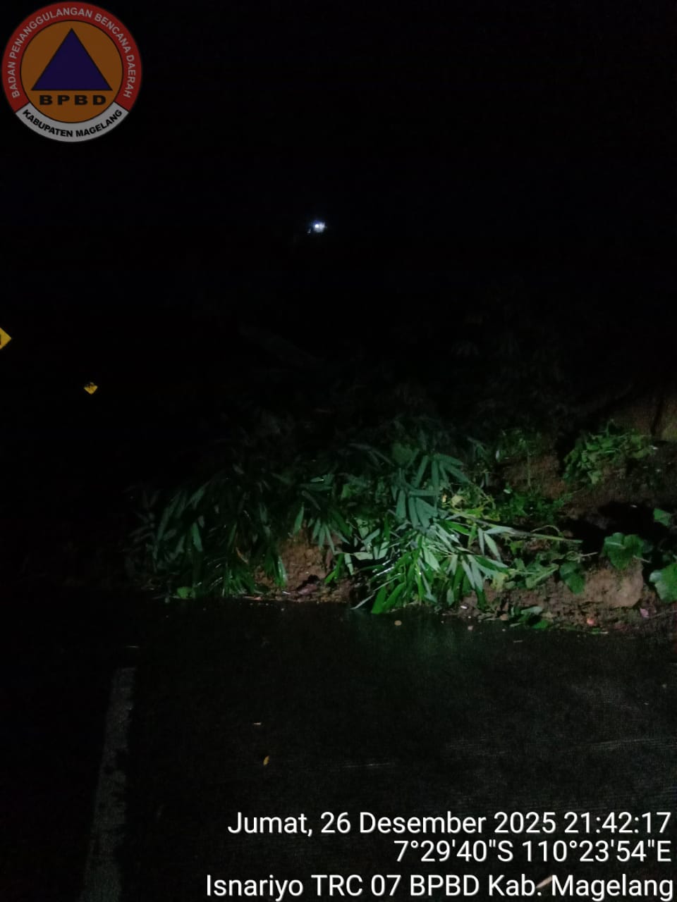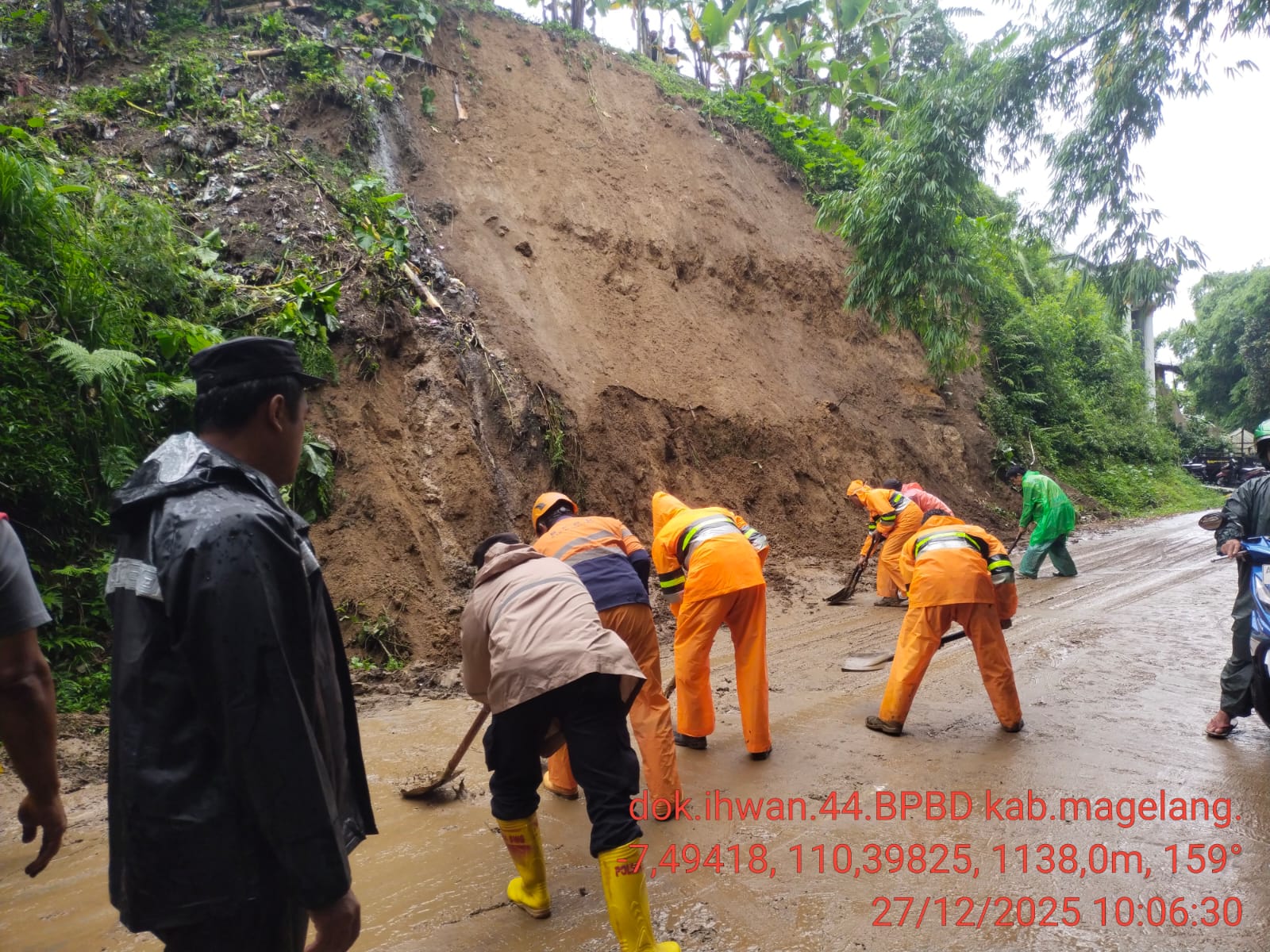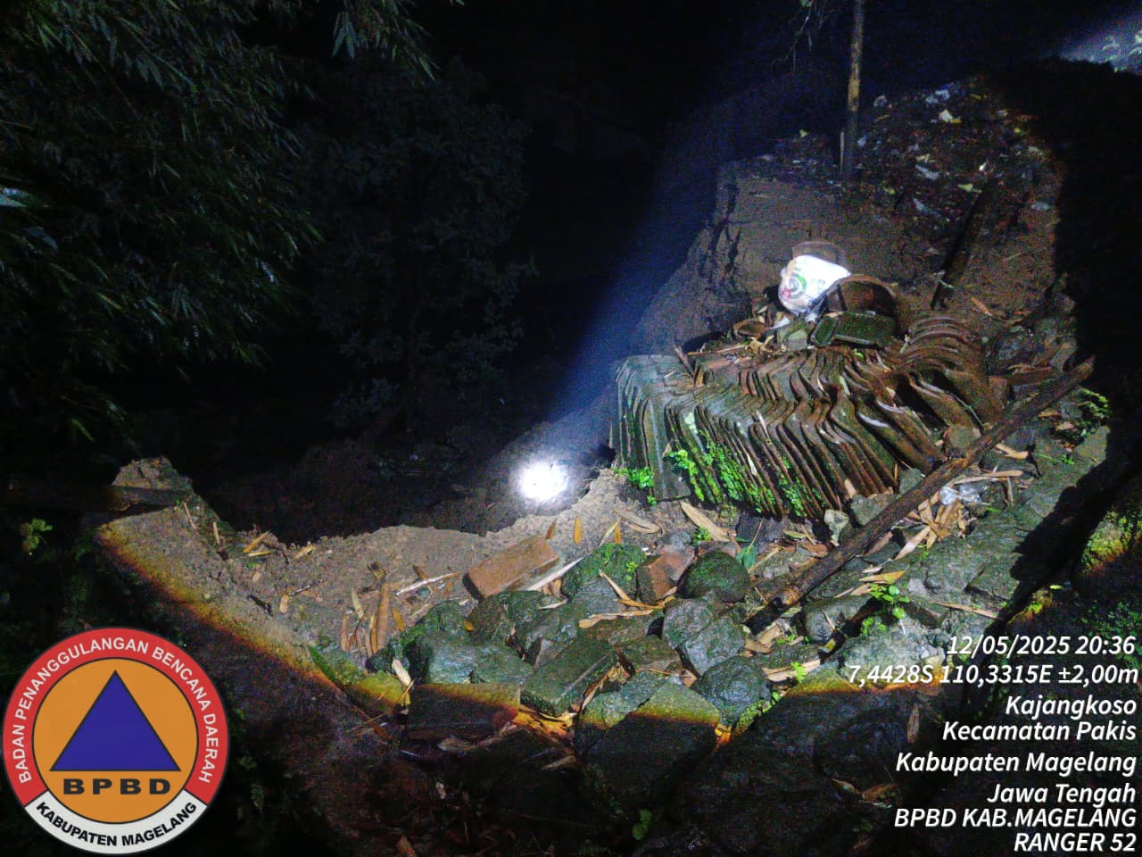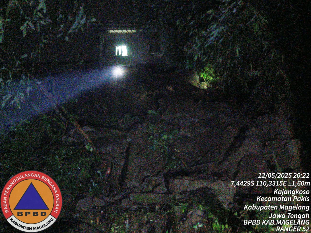 Hujan intensitas sedang | Hujan intensitas sedang mengguyur wilayah Kecamatan Kajoran memicu terjadinya tanah longsor dengan dimensi tinggi ±7 meter, lebar ±5 meter, dan ketebalan material ±2 meter. Material longsoran menutup sebagian akses jalan desa serta mengancam rumah milik Wagino (59) 2 KK, 7 jiwa. Material turut membawa batang pohon yang kemudian tumbang mengenai jaringan listrik, menyebabkan beberapa dusun mengalami listrik padam. | 0 orang | Detail | |