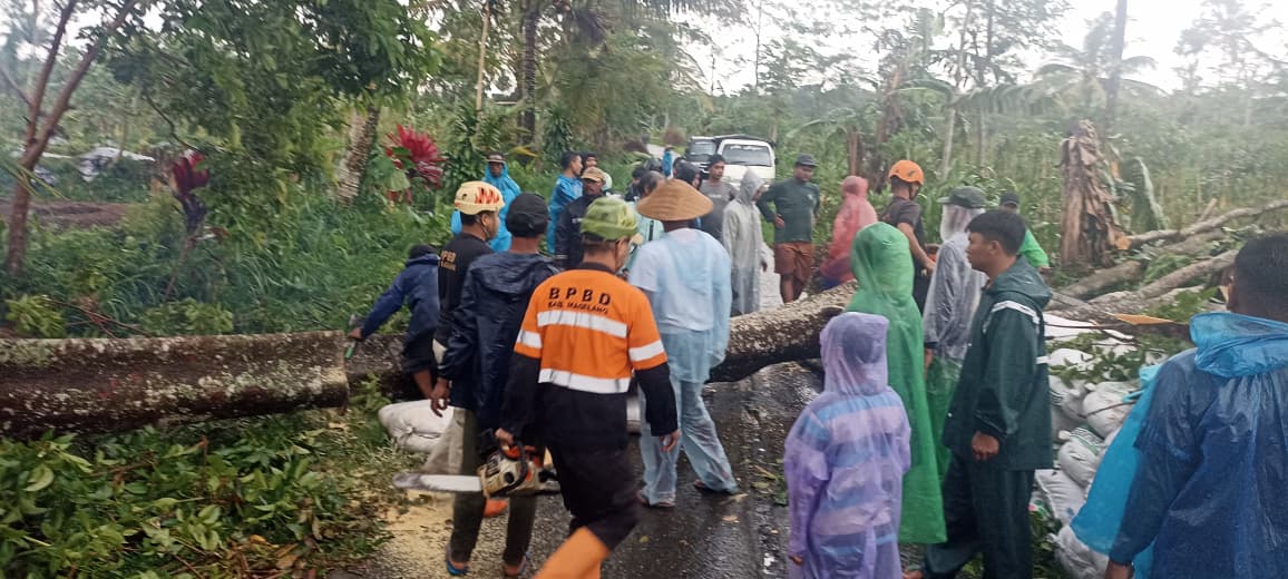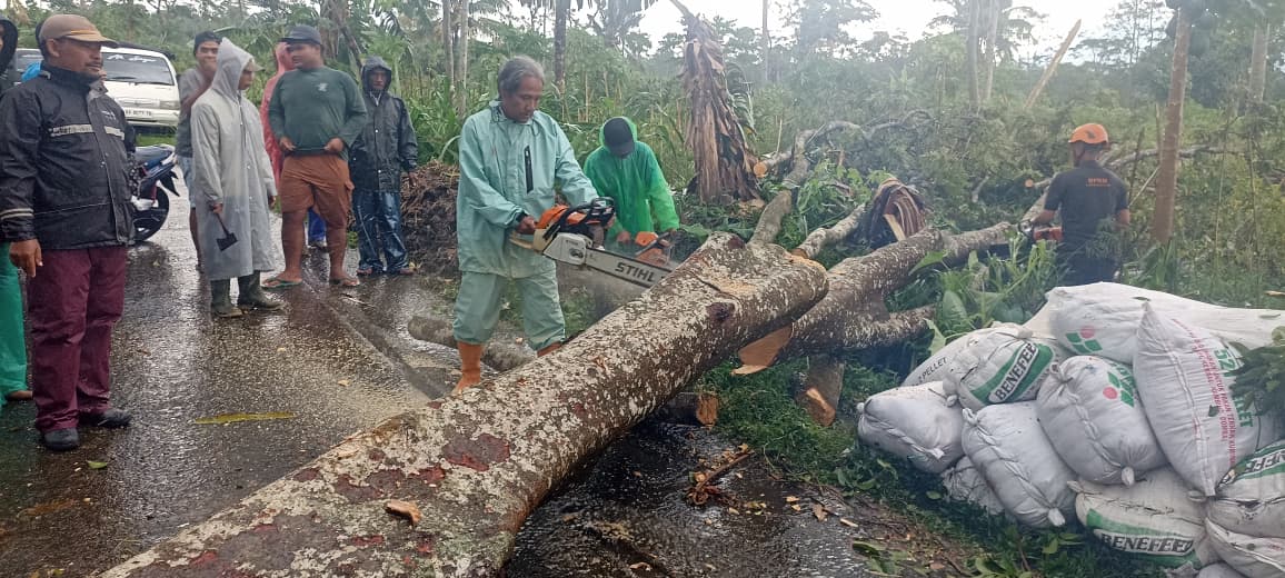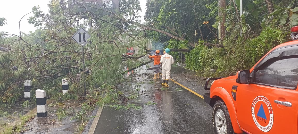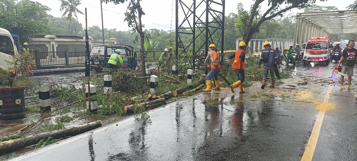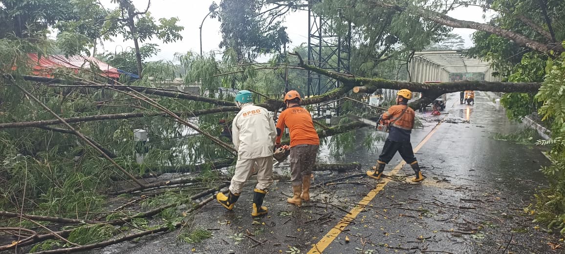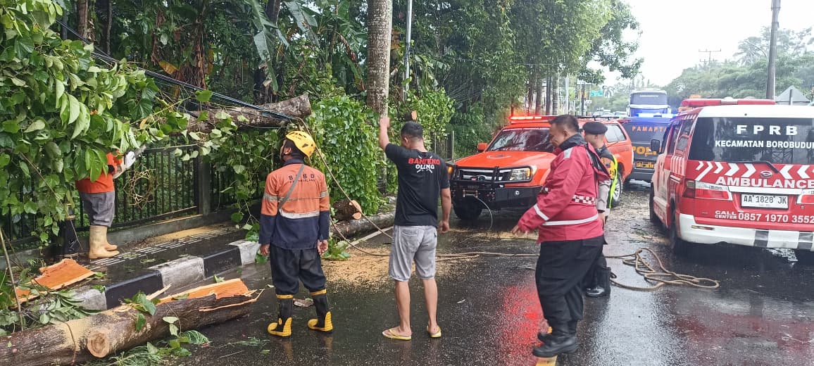 Hujan intensitas sedang disertai angin kencang | Hujan intensitas sedang di sertai angin kenceng di Kecamatan Mungkid pada Minggu, 1 Februari 2026 pada pagi hari menyebabkan 3 pohon tumbang menutup akses jalan Mendut - Borobudur (Jalan Provinsi) tepatnya di timur jembatan Brojonalan Dsn. Sawitan 1, Kelurahan Sawitan. | 0 orang | Detail | |
