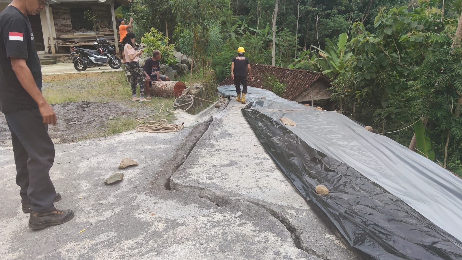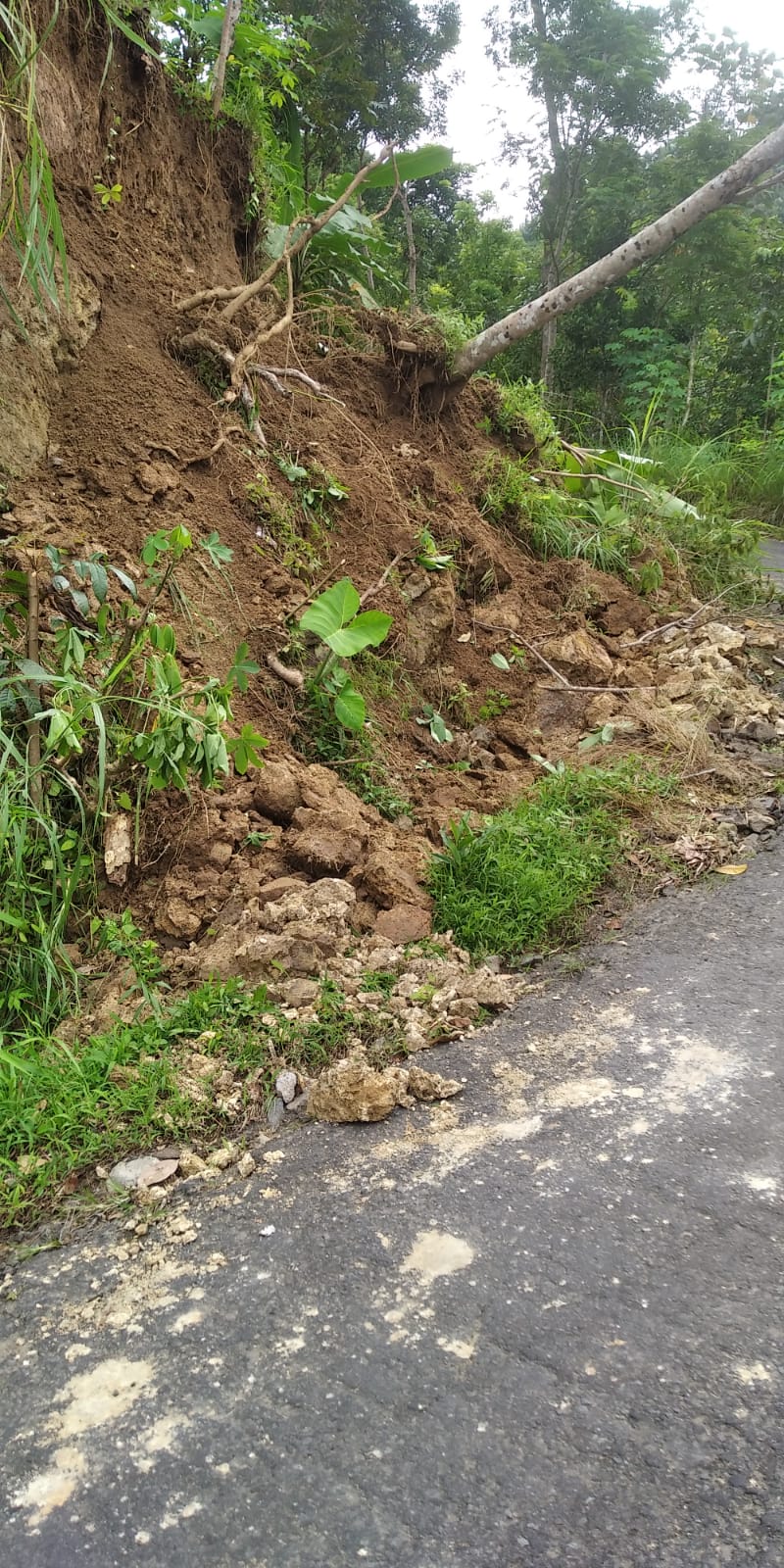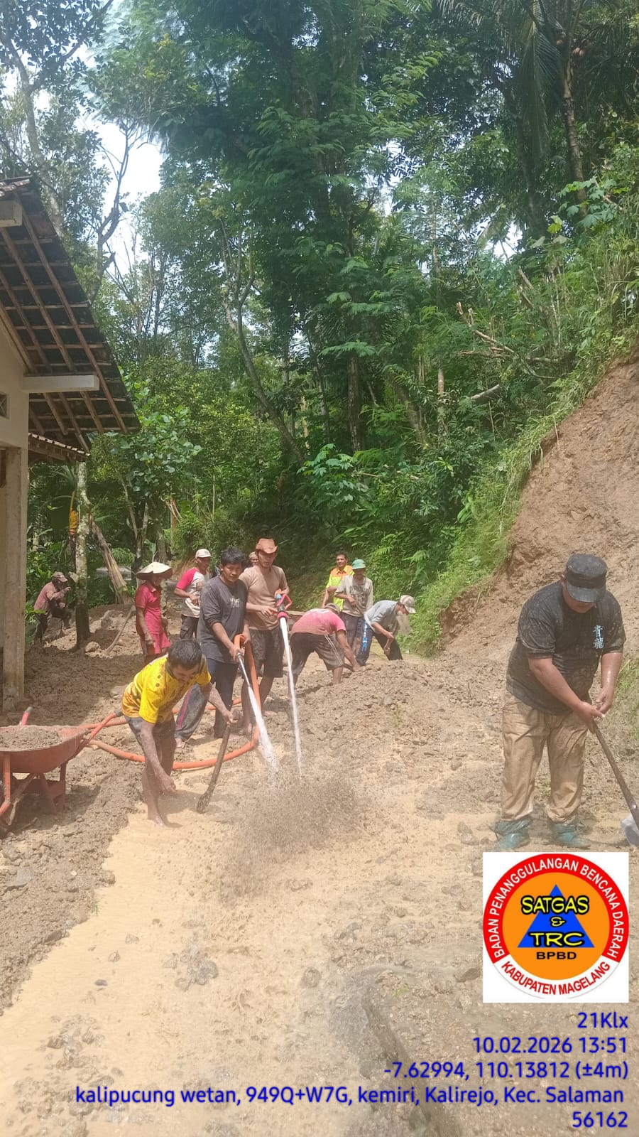 Hujan dengan intensitas sedang hingga lebat yang berlangsung sejak sore hingga malam hari serta kondisi tanah yang labil. | Hujan dengan intensitas sedang hingga lebat mengguyur wilayah Desa Kenalan, Kecamatan Borobudur, pada Senin, 09 Februari 2026 sejak sore hingga malam hari. Kondisi tersebut menyebabkan tanah pada tebing dengan tinggi ±5 meter di sekitar jalan penghubung Dusun Kemlokoh 1 dan Dusun Wonolelo mengalami pergerakan tanah yang ditandai dengan munculnya rekahan pada badan jalan dan untuk tebing jalan sudah di Talud/ Pondsi. Rekahan terpantau pada Selasa, 10 Februari 2026 pukul 16.30 WIB dengan panjang ±50 meter dan lebar ±10–15 cm. Akibat kejadian tersebut, akses jalan antar dusun tidak dapat dilalui kendaraan roda dua maupun roda empat karena membahayakan keselamatan pengguna jalan. Selain mengganggu akses transportasi warga, rekahan tersebut juga mengancam 1 unit rumah milik Bp. Purwanto (1 KK/4 jiwa) yang berada ±3 meter dari lokasi rekahan. | 0 orang | Detail | |