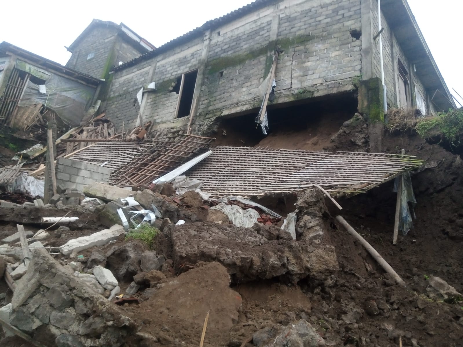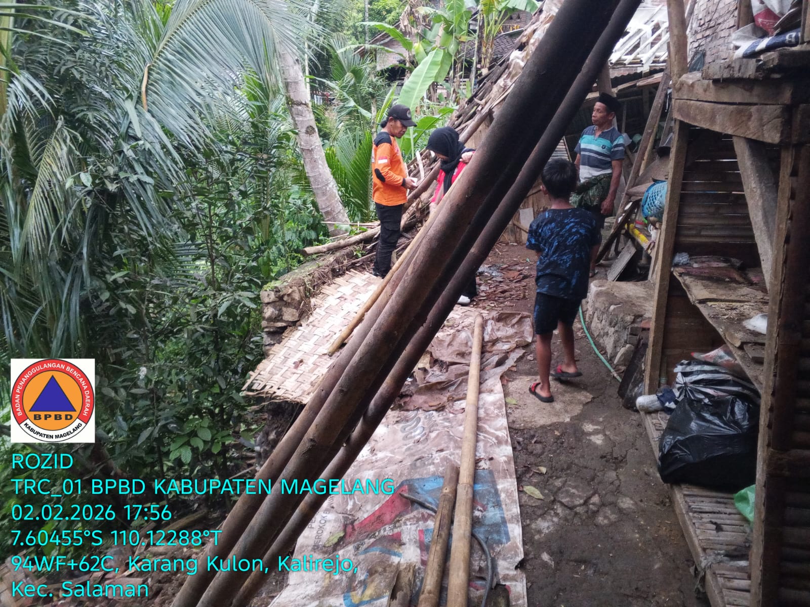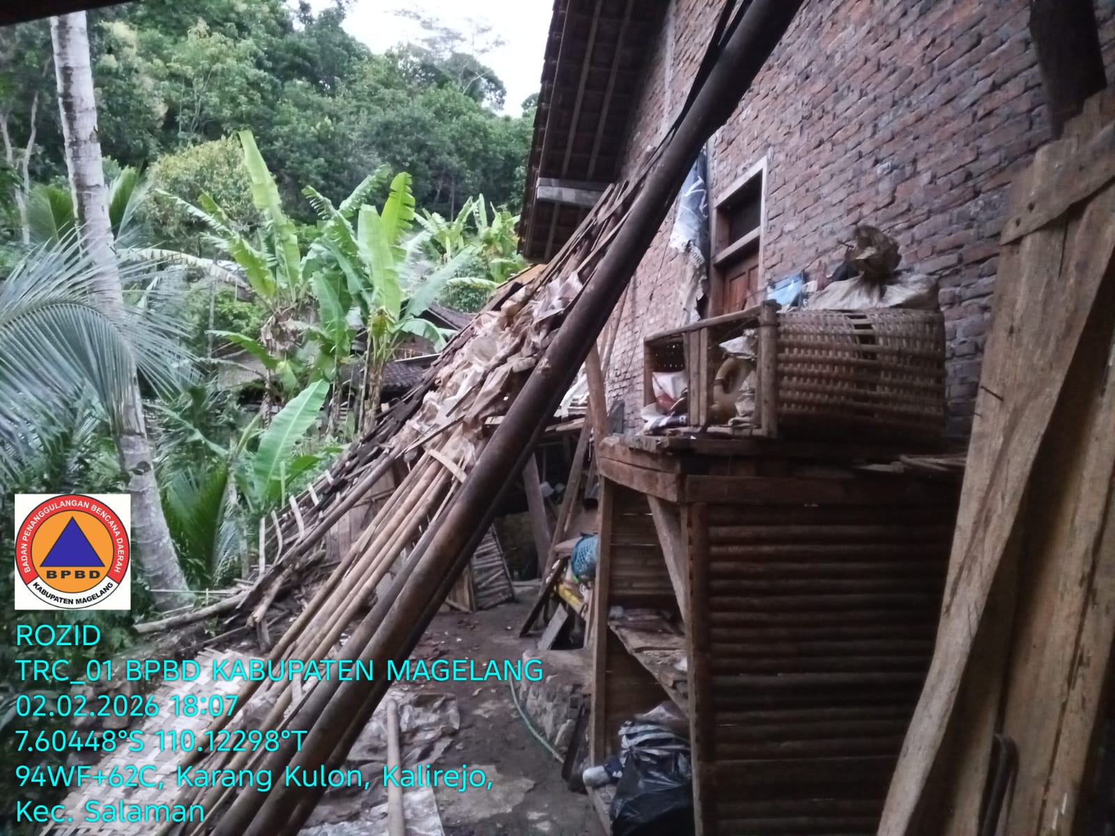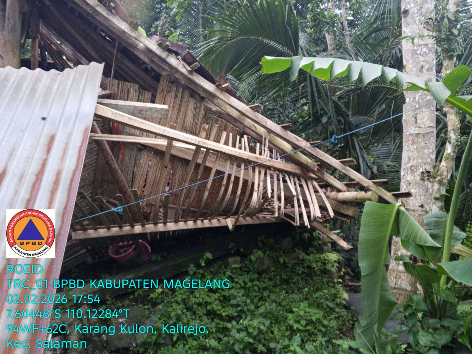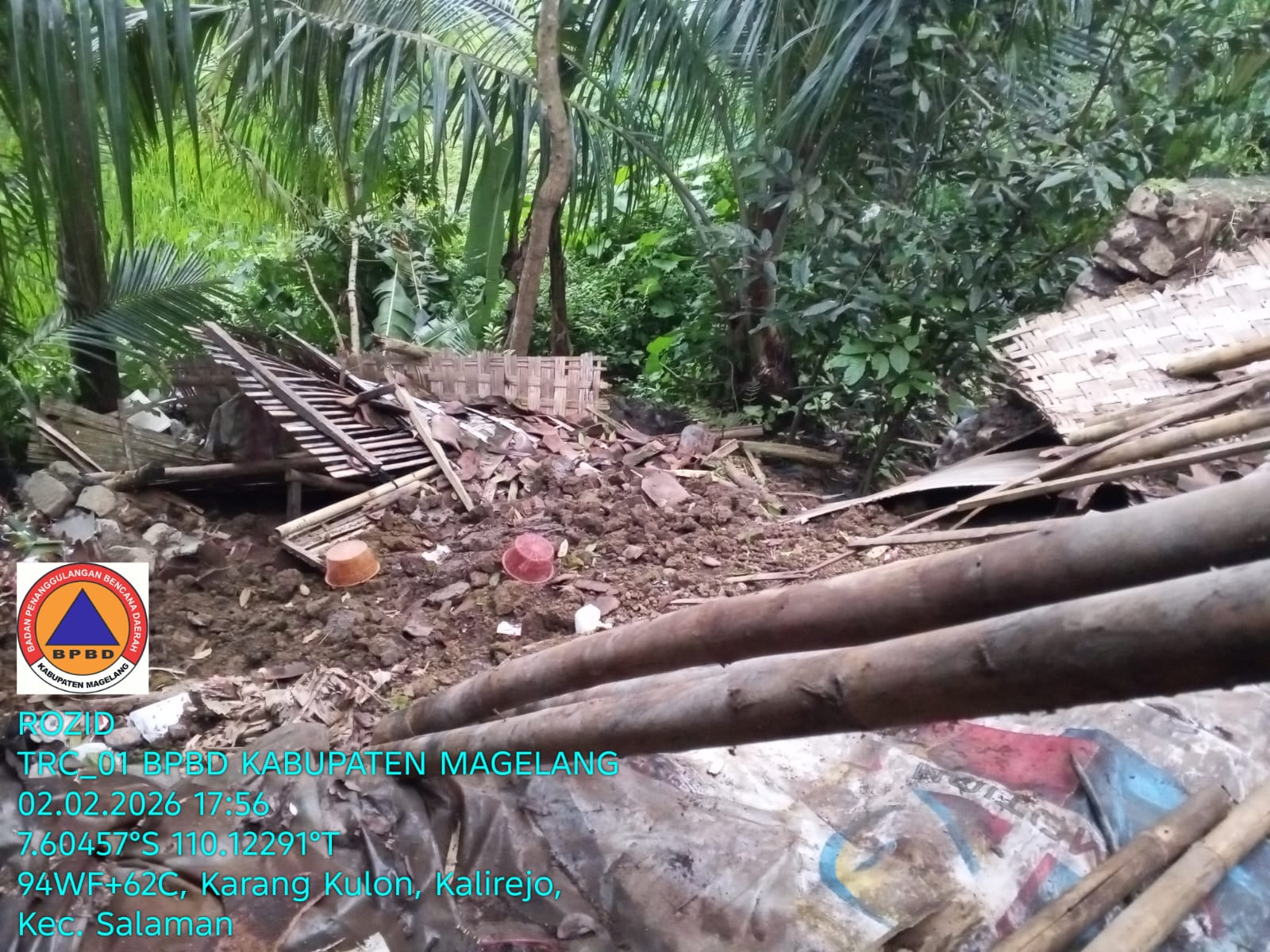 Hujan dengan intensitas sedang - lebat | Hujan dengan intensitas sedang - lebat yang terjadi di Kecamatan Kajoran pada Jumat , 06 Februari 2026 sore hari hingga malam menyebabkan tebing dengan tinggi ± 7 m dengan panjang tebing 10 m longsor tepatnya di Dusun Tlahap Jurang, Desa Lesanpuro. Material longsoran mengenai dinding rumah milik Bp. Mat Tolkah 1 KK/ 4 jiwa (Rumah tidak mengalami kerusakan). Selain itu, longsor juga mengancam bahu jalan Dusun Tlahap. Sebelum terjadi longsor, pada 1 Februari 2026 tebing bahu jalan tersebut sudah terdapat retakan, yang kemudian oleh warga ditutup untuk mengantisipasi terjadi longsor, dan pada Tahun 2025 tebing bahu jalan tersebut sudah dilakukan penanaman rumput vertiver sebagai upaya untuk memperkuat tebing. | 0 orang | Detail | |