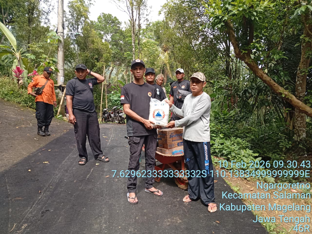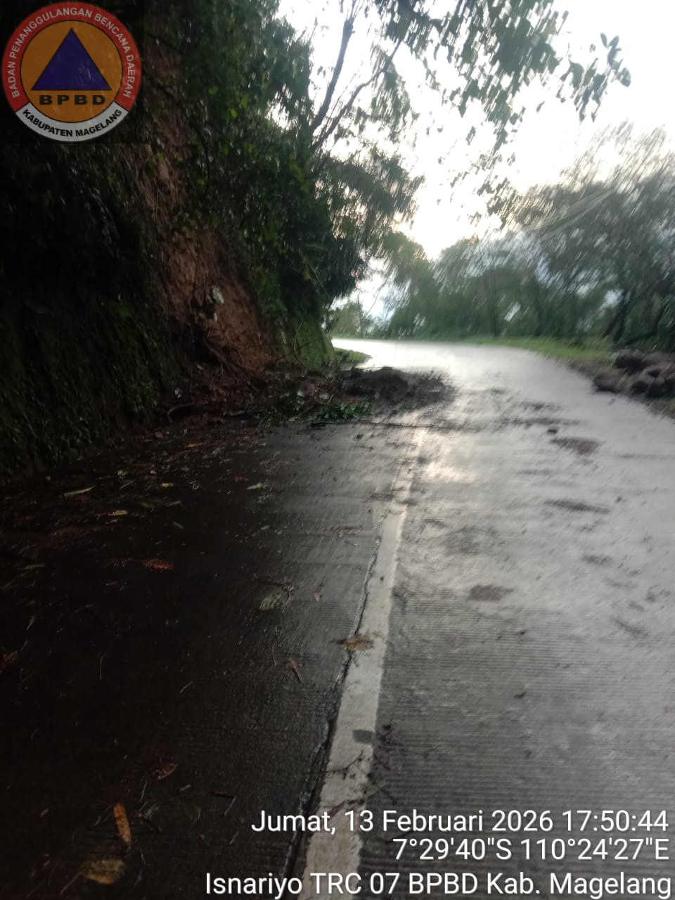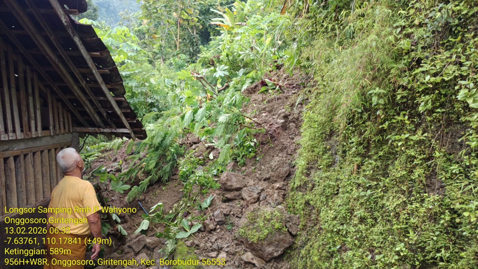 Hujan dengan intensitas sedang | Hujan dengan intensitas sedang terjadi di Kecamatan Borobudur pada Jumat, 13 Februari 2026 pada pagi hari menyebabkan tebing dengan tinggi 5m dan panjang 10m longsor menutup akses jalan dusun dan mengancam 2 rumah milik Bp. Budi 1kk 4jiwa yang berada di bawah longsoran dan Bp. Prapto 1kk 2jiwa yang berada di atas tebing tepatnya di Dsn. Miriombo Kulon Desa Giripurno. | 0 orang | Detail | |