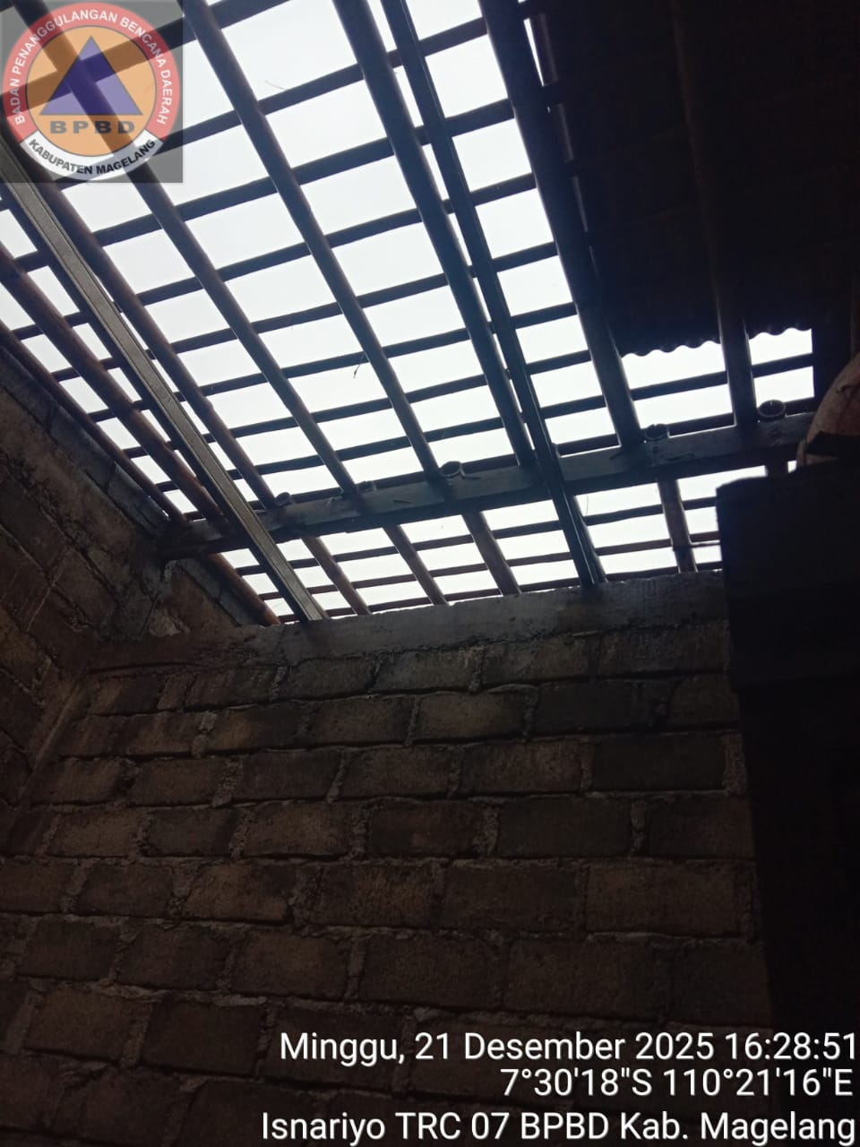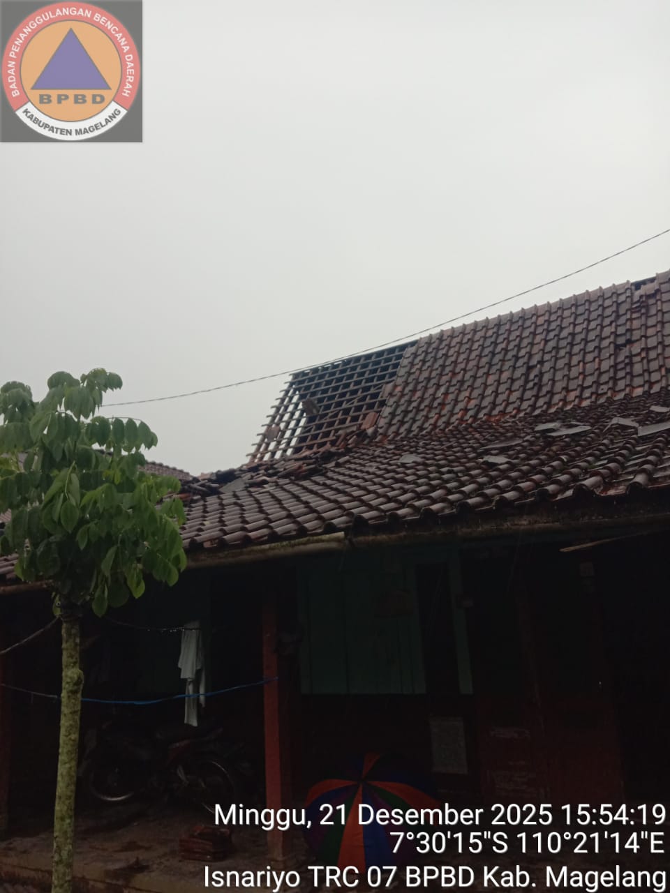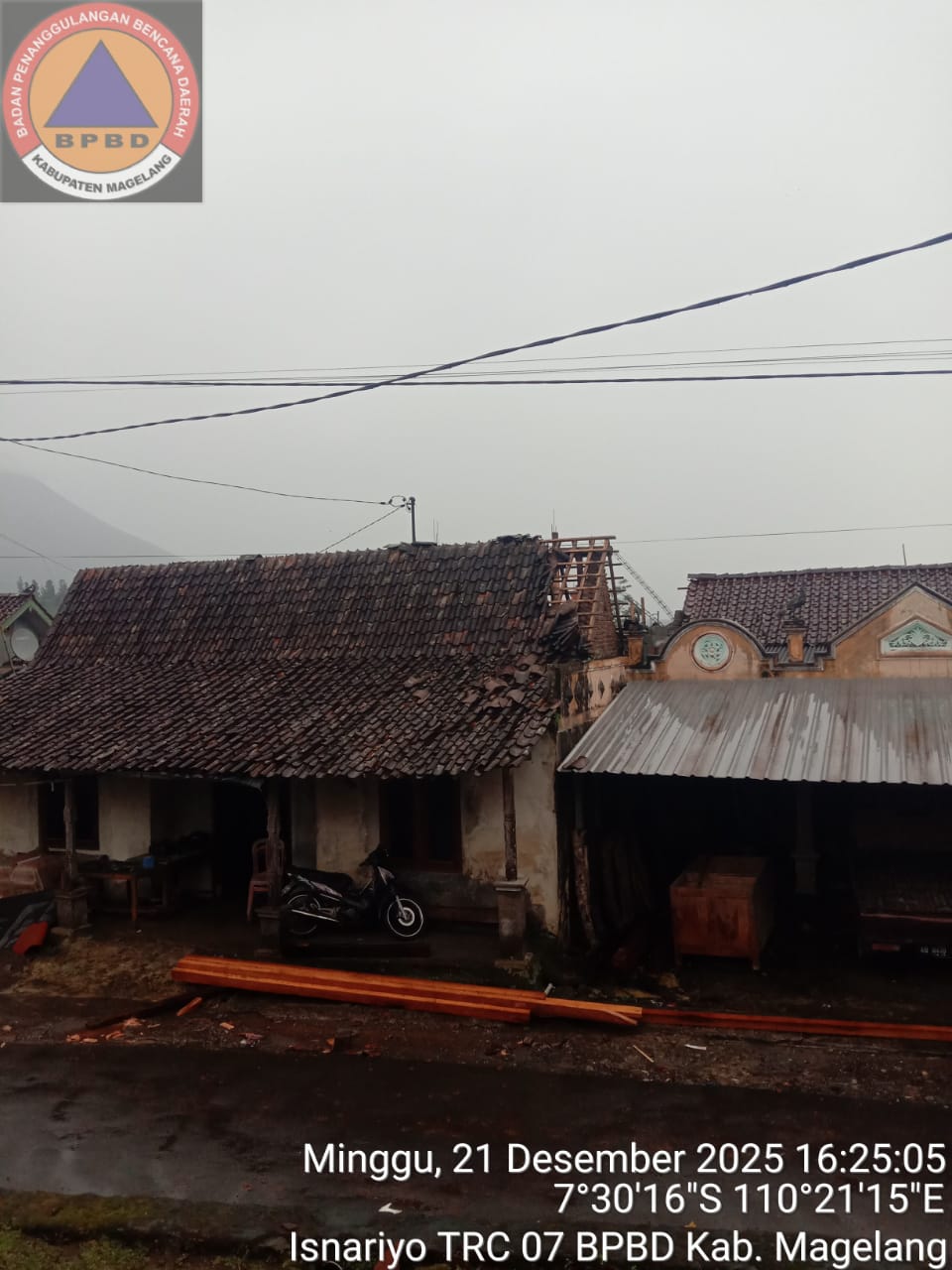Kontruksi rumah lapuk | Hujan dengan intensitas sedang terjadi di Kecamatan Ngablak pada Senin, 22 Desember 2025 sore hari mengakibatkan atap rumah di bagian dapur milik Bp. Sutikno 33th 1kk 3jiwa roboh. Kejadian tersebut di sebbabkan oleh kontruksi rumah yang sudah lapuk tidak kuat menahan beban genting yang basah sehingga roboh dan mengalami rusak ringan. | 0 orang | Detail | |
