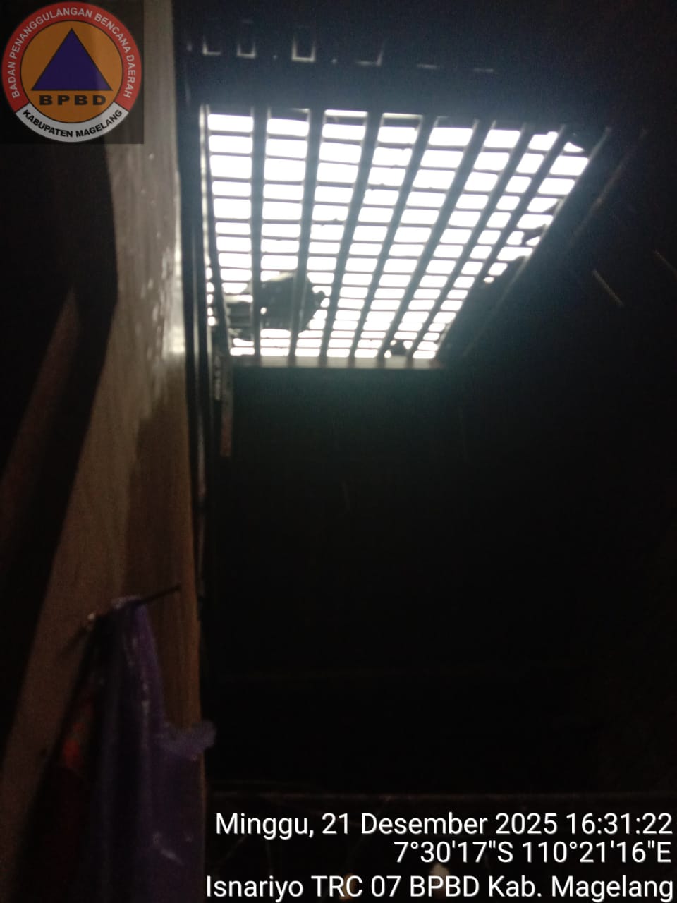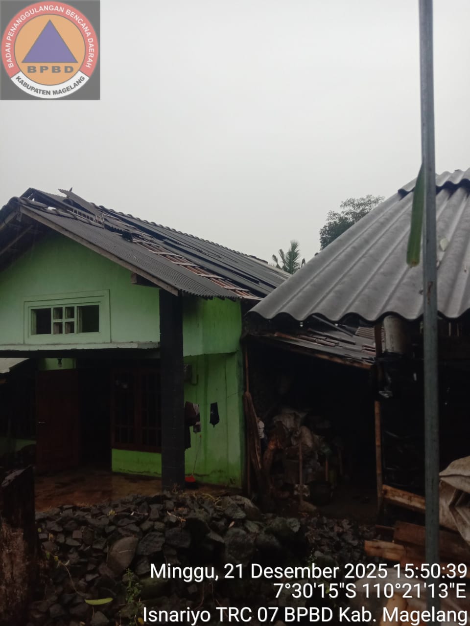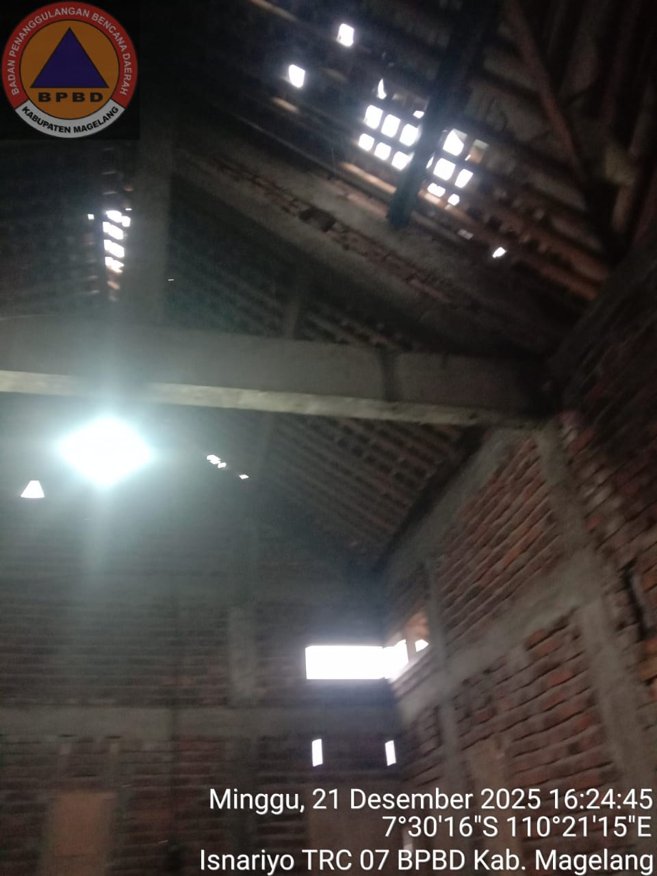Kontruksi rumah lapuk | Hujan dengan intensitas sedang terjadi di Kecamatan Ngablak pada Senin, 22 Desember 2025 sore hari mengakibatkan atap rumah di bagian dapur milik Bp. Sutikno 33th 1kk 3jiwa roboh. Kejadian tersebut di sebbabkan oleh kontruksi rumah yang sudah lapuk tidak kuat menahan beban genting yang basah sehingga roboh dan mengalami rusak ringan. | 0 orang | Detail | |