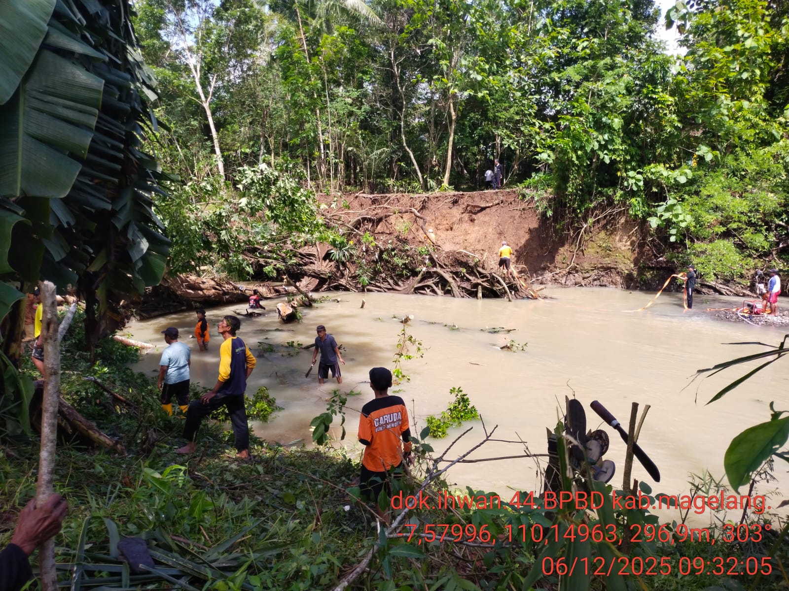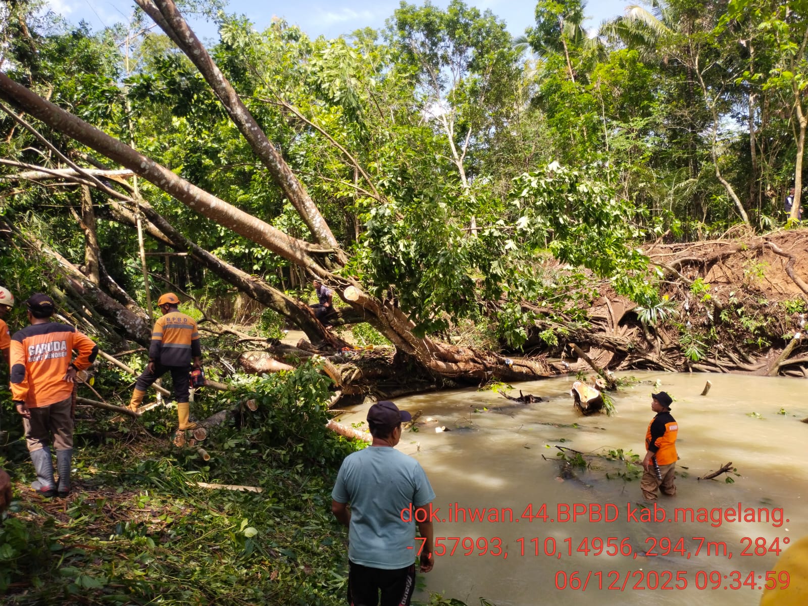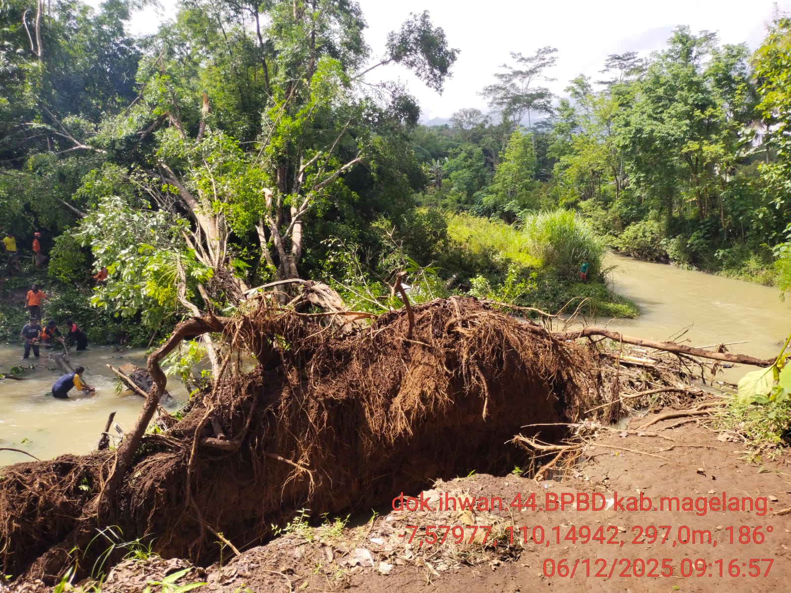 Debit sungai meningkat dan arus deras | Hujan dengan intensitas sedang hingga lebat terjadi di wilayah Kecamatan Salaman pada Jumat, 5 Desember 2025. Kondisi ini memicu abrasi tebing Sungai Kluban yang menyebabkan Pohon Beringin setinggi ±20 m dan diameter ±5m di tepian sungai roboh. Akar dan batang pohon jatuh ke badan sungai dan menutup aliran air tepat di Dusun Nusupan, Desa Salaman. Di lokasi tersebut terdapat jembatan berjarak 70 meter dari titik pohon roboh, sehingga apabila material pohon terbawa arus, berpotensi menyumbat aliran air di bawah jembatan. Jarak permukiman terdekat dari tebing Sungai Kluban berada pada radius sekitar 30 meter | 0 orang | Detail | |