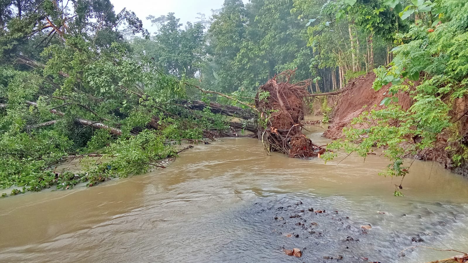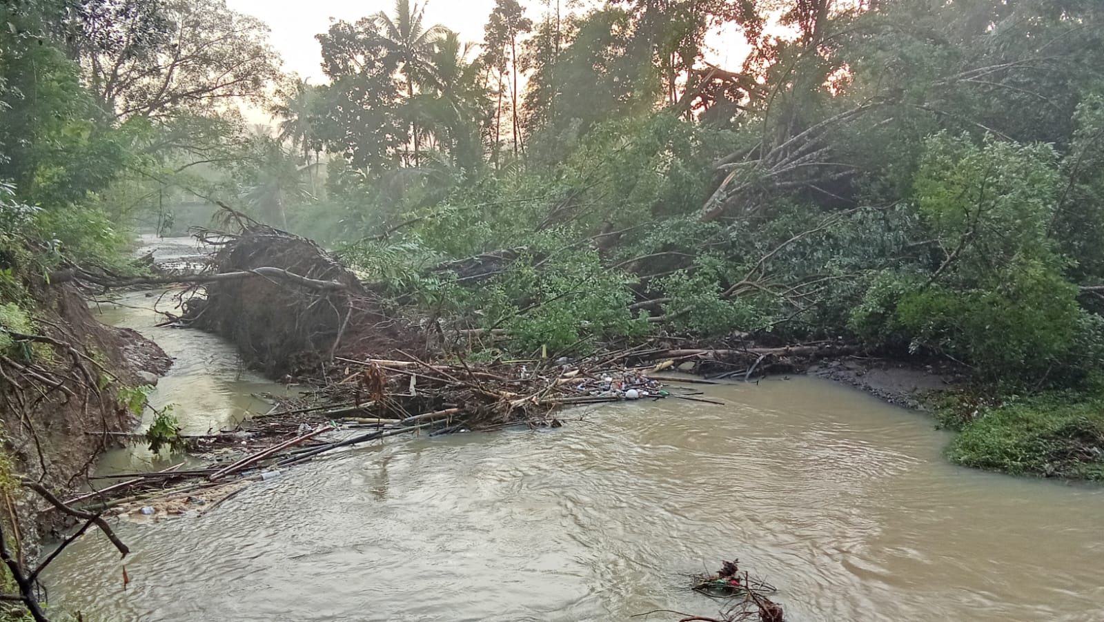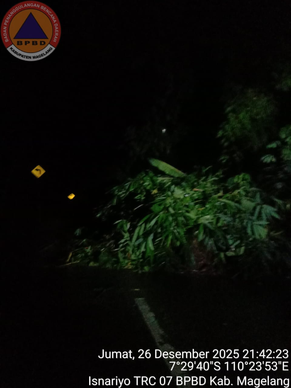 Debit sungai meningkat dan arus deras | Hujan dengan intensitas sedang hingga lebat terjadi di wilayah Kecamatan Salaman pada Jumat, 5 Desember 2025. Kondisi ini memicu abrasi tebing Sungai Kluban yang menyebabkan Pohon Beringin setinggi ±20 m dan diameter ±5m di tepian sungai roboh. Akar dan batang pohon jatuh ke badan sungai dan menutup aliran air tepat di Dusun Nusupan, Desa Salaman. Di lokasi tersebut terdapat jembatan berjarak 70 meter dari titik pohon roboh, sehingga apabila material pohon terbawa arus, berpotensi menyumbat aliran air di bawah jembatan. Jarak permukiman terdekat dari tebing Sungai Kluban berada pada radius sekitar 30 meter | 0 orang | Detail | |