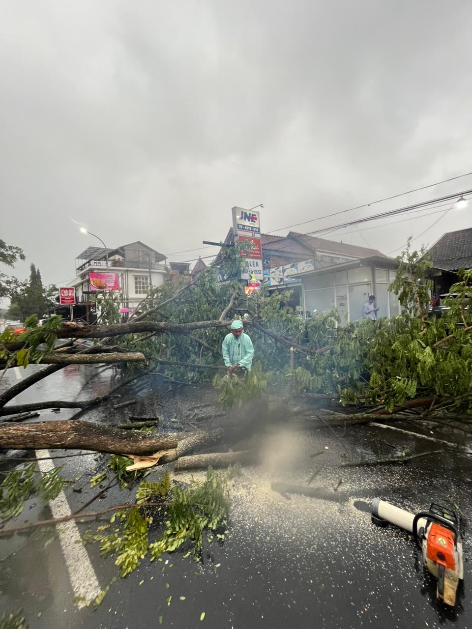 Hujan dengan intensitas lebat disertai angin kencang | Pukul 13.00 WIB terjadi hujan dengan intensitas lebat di Kecamatan Borobudur. Kondisi tersebut menyebabkan satu pohon trembesi berdiameter ±60 cm tumbang dan menutup akses Jalan Utama Candi Borobudur, tepatnya di depan Hotel Alea, Jalan Balaputra Dewa, Borobudur. Selain itu satu tiang lampu penerangan jalan juga roboh. Kejadian ini mengakibatkan arus lalu lintas terganggu dan akses jalan tertutup sementara. | 0 orang | Detail | |