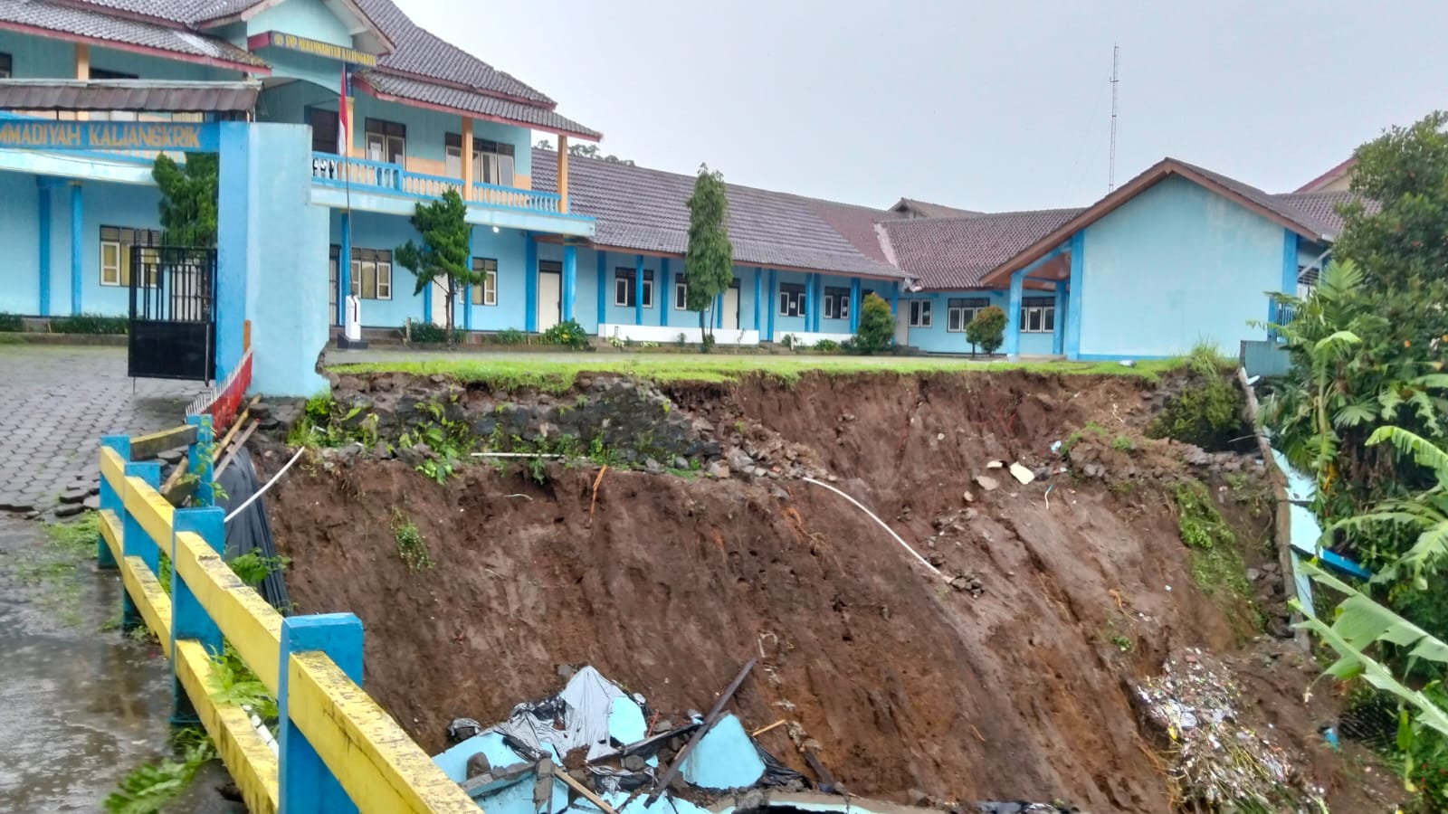 Curah hujan dengan intensitas tinggi | Curah hujan dengan intensitas tinggi mengguyur wilayah Kecamatan Kaliangkrik sejak siang hari yang mengakibatkan kondisi tanah di sekitar SMP Muhammadiyah Beseran menjadi labil hingga terjadi tanah longsor. Dampak dari kejadian tersebut pagar sekolah ambrol dan material longsoran menutup saluran irigasi di sekitar lokasi kejadian. Tertutupnya saluran irigasi tersebut mengakibatkan luapan air yang menggenangi rumah-rumah warga di sekitarnya. Selain itu, terdapat satu pohon dalam kondisi miring/mendoyong akibat terdesak material longsoran dan berpotensi roboh sehingga mengancam dua rumah milik Bp. Mamat 40th 1KK/4 Jiwa dan Bp. Sapto 35th 1KK/ 4 Jiwa. Kondisi tanah dan tebing masih labil serta berpotensi terjadi longsor susulan apabila hujan kembali turun dengan intensitas tinggi. | 0 orang | Detail | |
