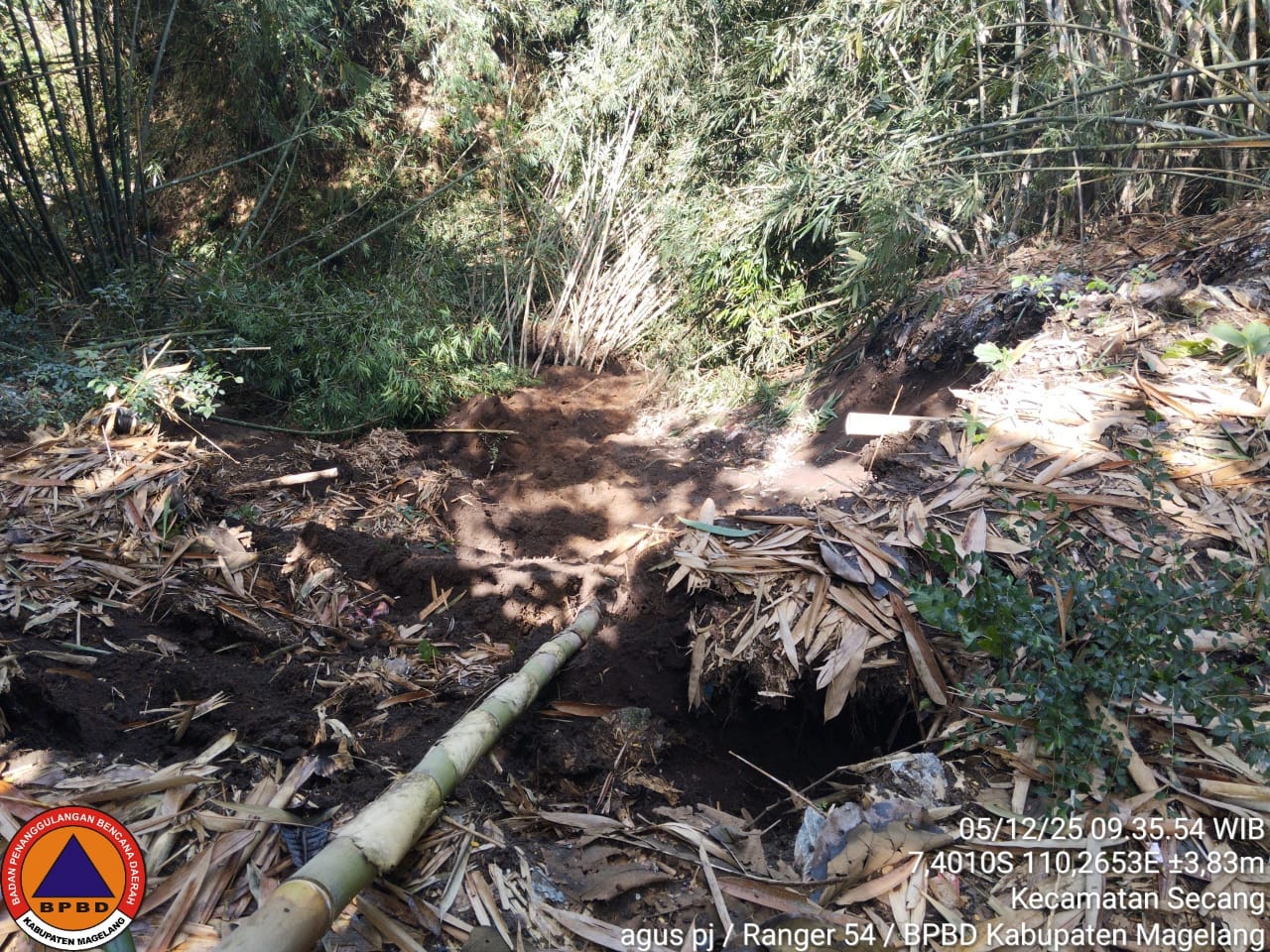 Hujan dengan intensitas sedang - lebat | Hujan dengan intensitas sedang terjadi di Kecamatan Secang pada Kamis, 04 Desember 2025 malam hari menyebabkan tebing dengan tinggi ±25 m dan panjang 6 m longsor. Material longsor menimpa pipa saluran air bersih yang berdampak terputusnya saluran air di 2 dusun yaitu Dsn. Tempuksari dan Dsn. Gioso Gunung. Selain itu material longsoran menutup aliran Sungai Anak Sumberan Kiri (Sungai Sebangkong) dan mengancam rumah milik Bp. Zakari 63th 1kk/3jiwa tepatnya di Dsn. Gioso Gunung, Ds. Candisari. Dari hasil kaji cepat masih terdapat 2 retakan dia atas mahkota longsor dengan panjang 15 meter dan lebar retakan 5 - 10 cm, dibawah retakan tersebut terdapat retakan dengan panjang 12 m dan lebar 5 -20 cm dan sudah amblas sekitar 12 cm yang berpotensi terjadinya longsor susulan. | 0 orang | Detail | |